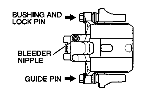 Install the bushing and lock pin to the bleeder nipple side at the caliper body, the guide pin to its opposite side, respectively.