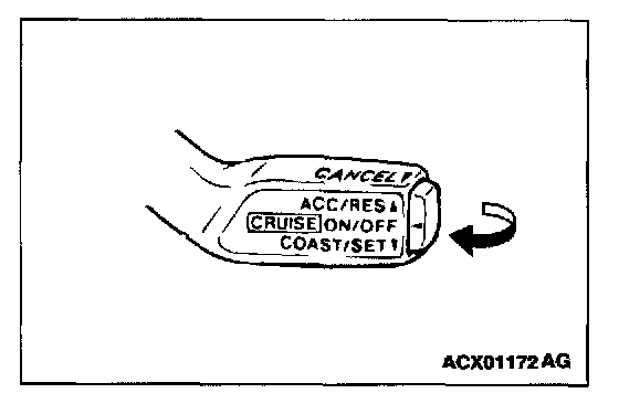 3. At a vehicle speed of 40 kph (25 mph) or higher, check if when the "RESUME" switch is switched "ON," the vehicle speed returns to the speed before auto-cruise control driving was cancelled, and constant speed driving occurs.