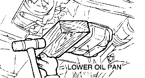 2. Place a wooden block against the lower oil pan as shown in the illustration and remove by tapping with a hammer.