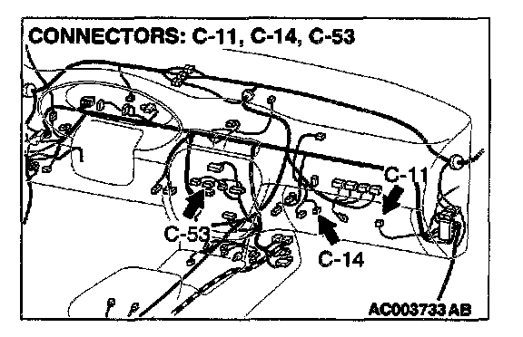 STEP 1. Check the harness wire between the blower fan and motor connector C-11, the resistor connector C-14, and the blower switch connector C-53.