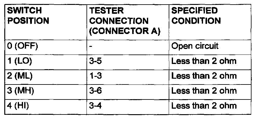 Q: Is the harness wire between the blower fan and motor connector C-11, the resistor connector C-14, and the blower switch connector C-53 in good condition?