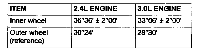 For each one turn of the left and right tie rods, the toe-in will be adjusted by approximately 1° 05' (per wheel).