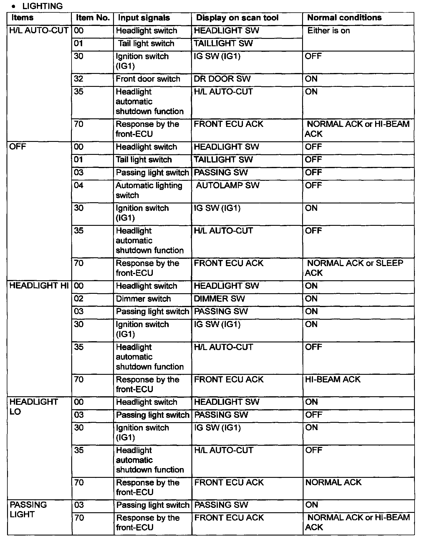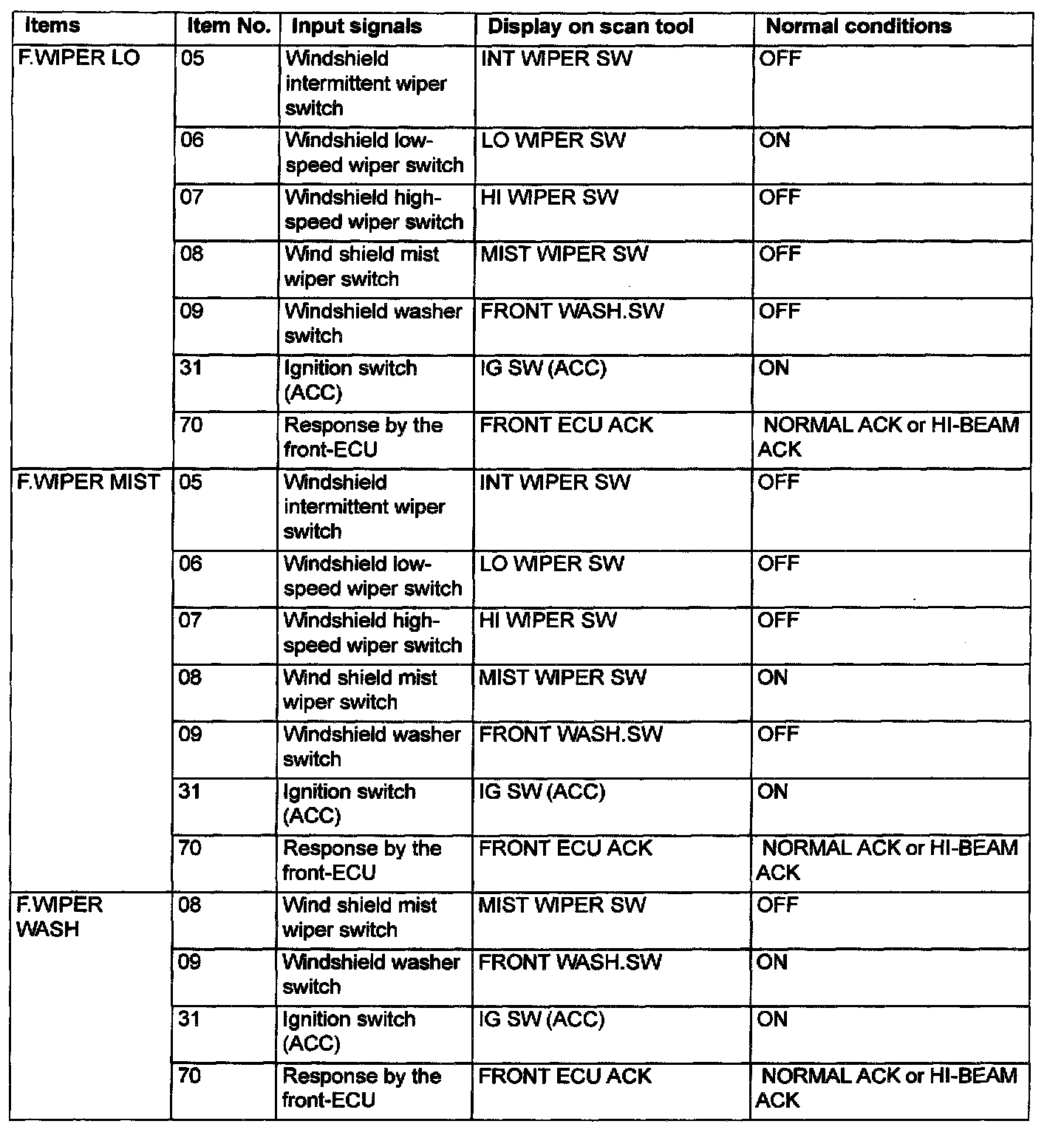 The table below shows the service data and their normal condition, which are displayed during the "FUNCTION DIAGNOSIS." The row "Normal conditions" shows values, which are shown when each operation is made.