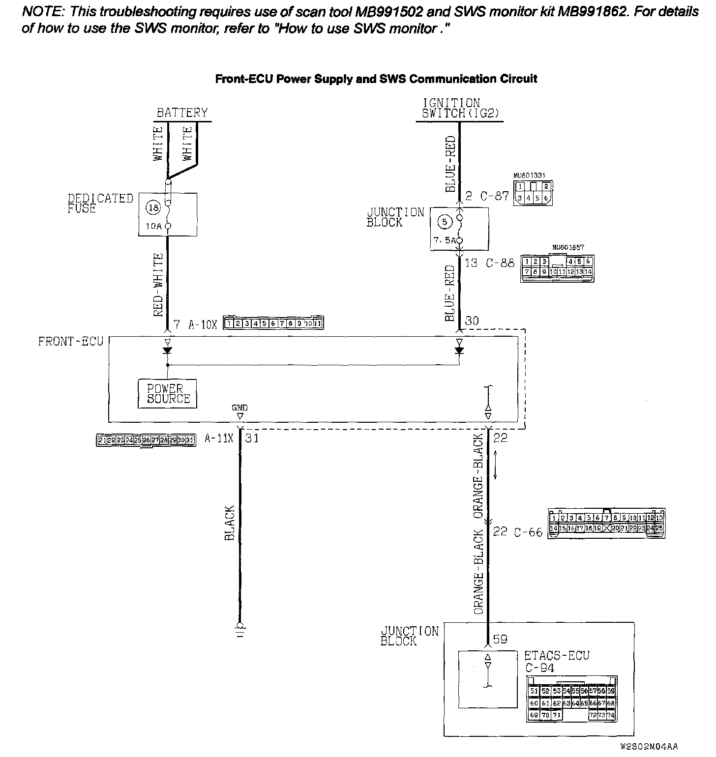 It is suspected that the power supply circuit to the front-ECU is defective, or the wiring harness between the SWS monitor kit and the front-ECU or their connector(s) is damaged. If the battery power supply circuit to the ECU (terminal No.7 of the front-ECU) is damaged, also check the power supply circuit from the ignition switch (IG2) (terminal No.30 of the front-ECU), and repair if necessary.