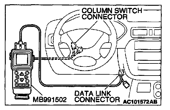 CAUTION: To prevent damage to scan tool MB991502, always turn the ignition switch to the "LOCK" (OFF) position before connecting or disconnecting scan tool MB991502. Also connect SWS monitor kit MB991862 after turning on scan tool MB991502.