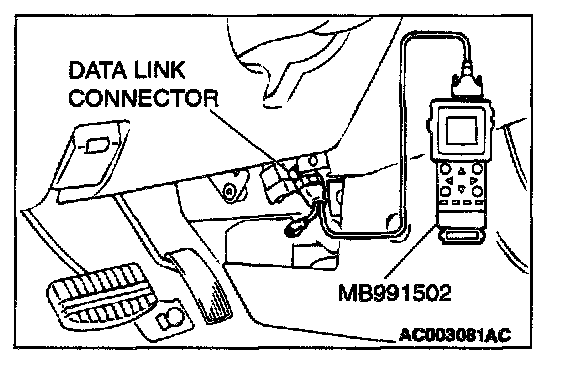 CAUTION: To prevent damage to scan tool MB991502, always turn the ignition switch to the "LOCK" (OFF) position before connecting or disconnecting scan tool MB991502.