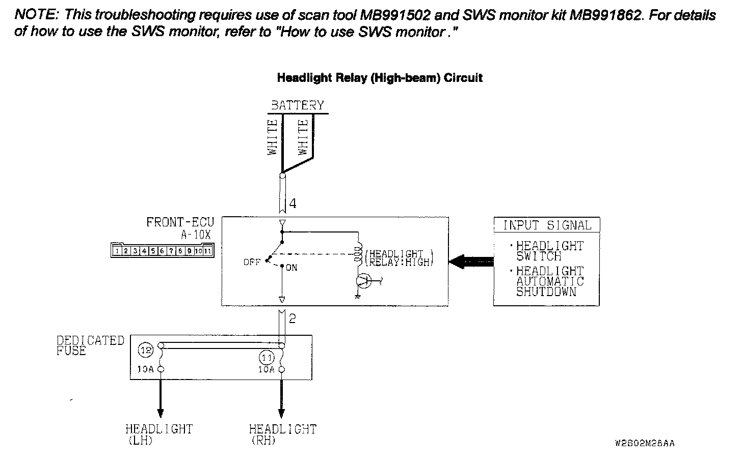CAUTION: To prevent damage to scan tool MB991502, always turn the ignition switch to the "LOCK" (OFF) position before connecting or disconnecting scan tool MB991502. Also connect SWS monitor kit MB991862 after turning on scan tool MB991502.