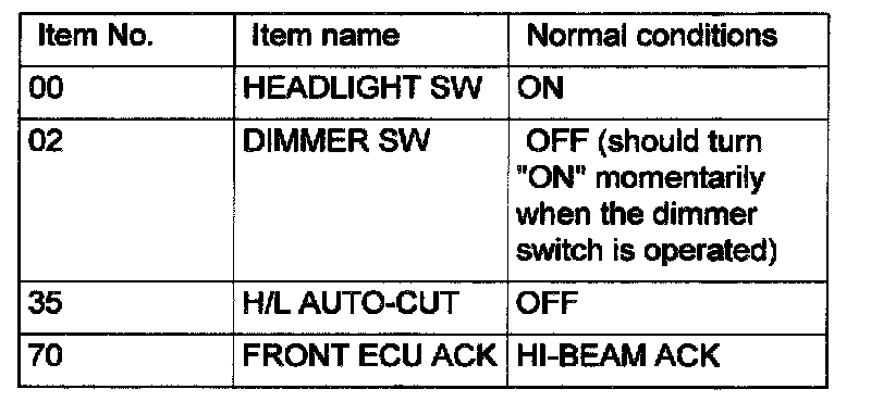 Select "LIGHTING - HEADLIGHT HI" (FUNCTION DIAG), and check that normal conditions are displayed on the items described in the table.