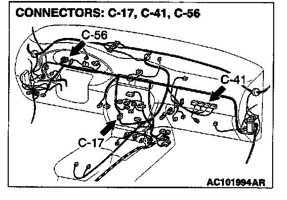 NOTE: Also check intermediate connector C-17 and joint connector C-56. If intermediate connector C-17 or joint connector C-56 is damaged, repair or replace the connector as described in Harness Connector Inspection.