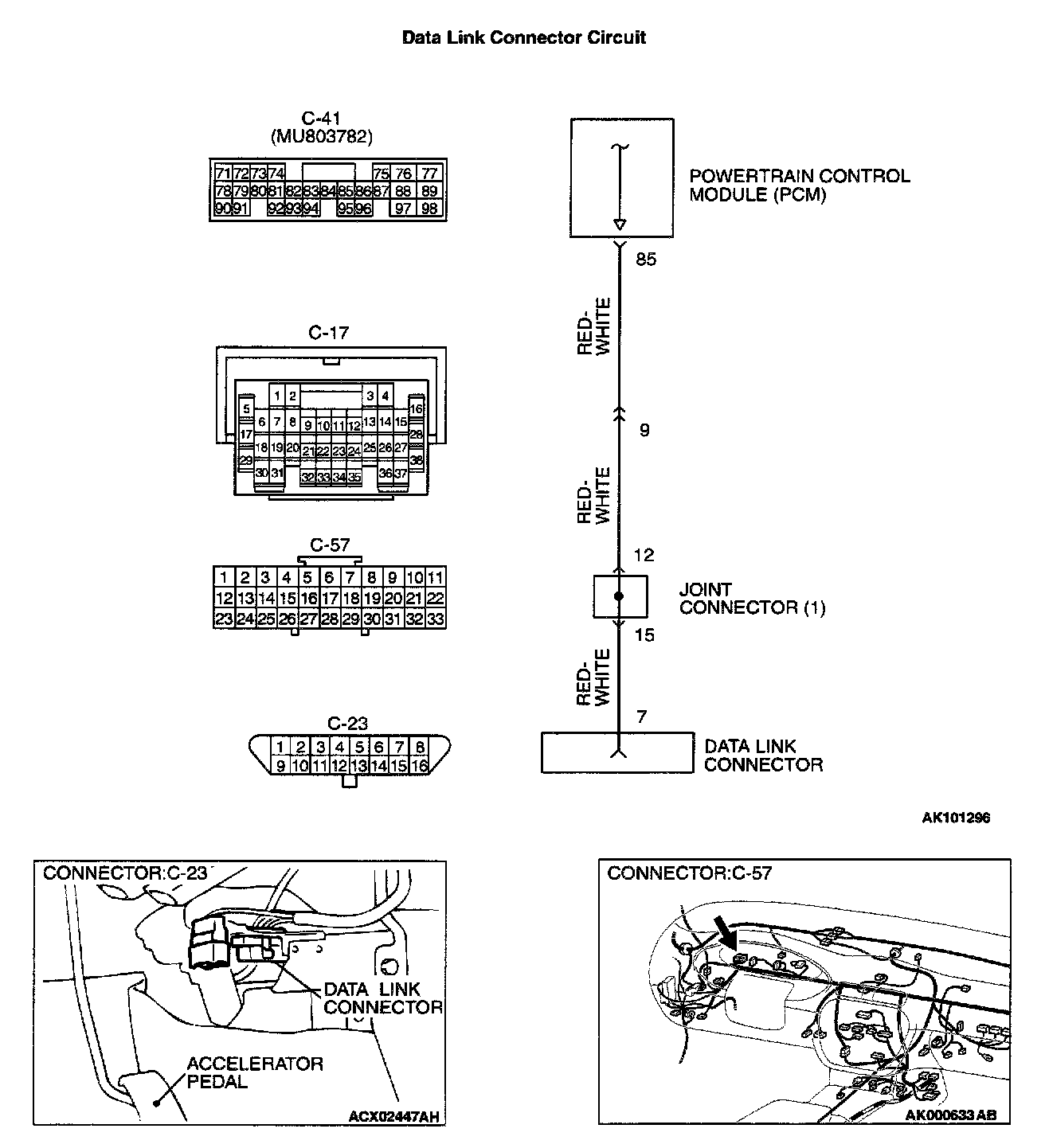 STEP 2. Check for open circuit, short circuit to ground and harness damage between data link connector C-23 terminal 7 and PCM connector C-41 terminal 85.
