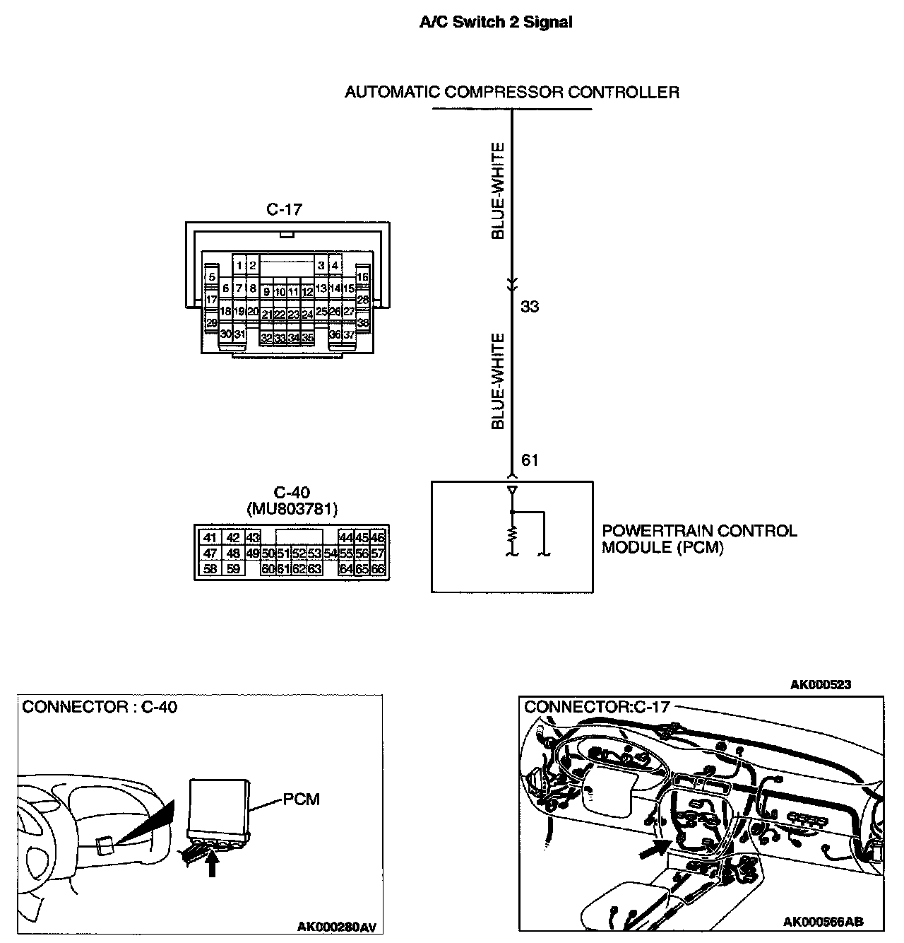 - The automatic compressor-ECU detects how the air conditioning is applying load to the engine. and converts the information to a voltage signal (High voltage = low load, Low voltage = high load). This voltage signal is called "A/C switch 2 signal". The PCM receives this A/C switch 2 signal from the automatic compressor controller through terminal 61, and determines the idle-up speed according to the high or low air conditioning load.