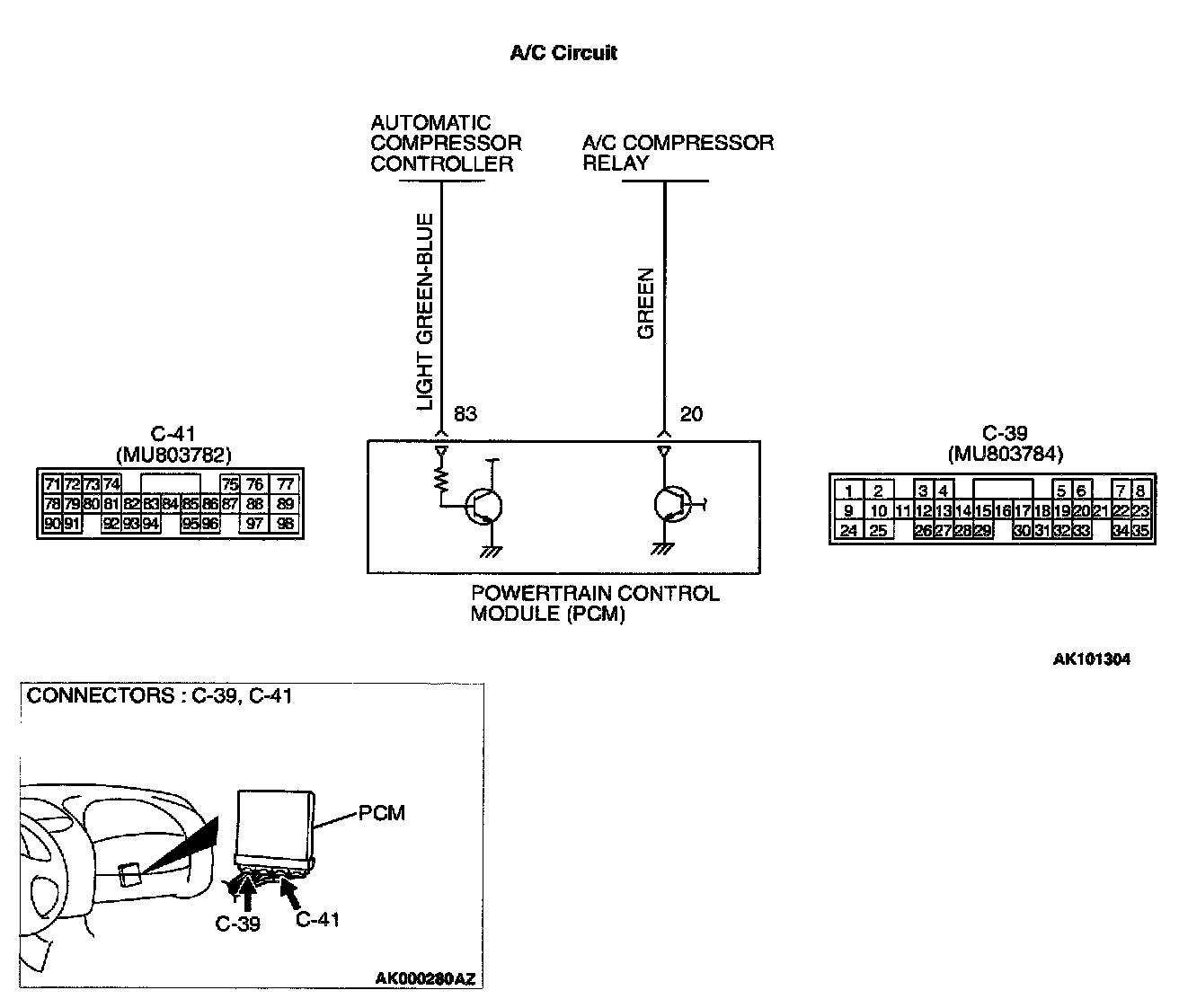 - When the A/C is "ON", the battery positive voltage is applied on the PCM (terminal 83) from the automatic compressor controller.