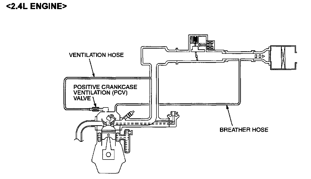 GENERAL INFORMATION (POSITIVE CRANKCASE VENTILATION SYSTEM)The positive crankcase ventilation system is a system for preventing the escape of blow-by gases from inside the crankcase into the atmosphere. Fresh air is sent from the air cleaner into the crankcase through the breather hose to be mixed with the blow-by gas inside the crankcase.