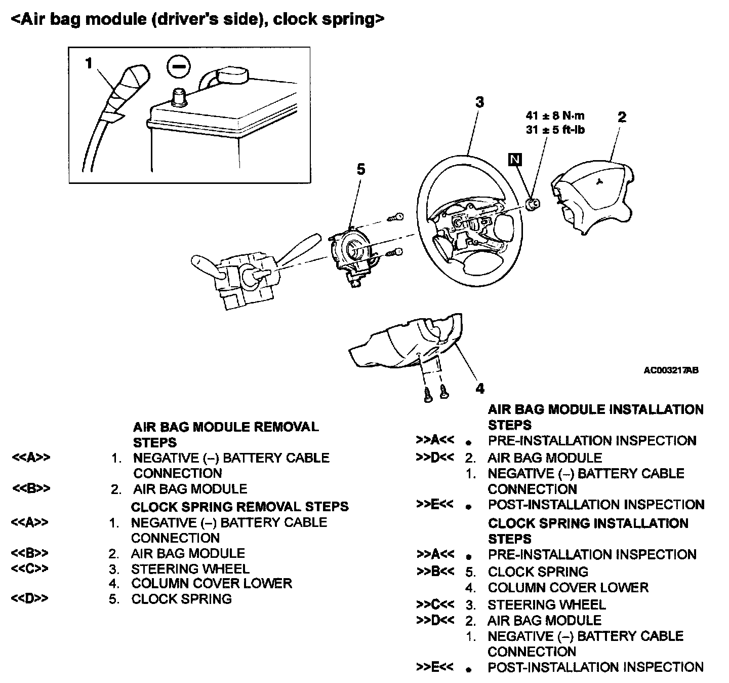 - Never attempt to disassemble or repair the air bag modules or clock spring. If faulty, replace it.
