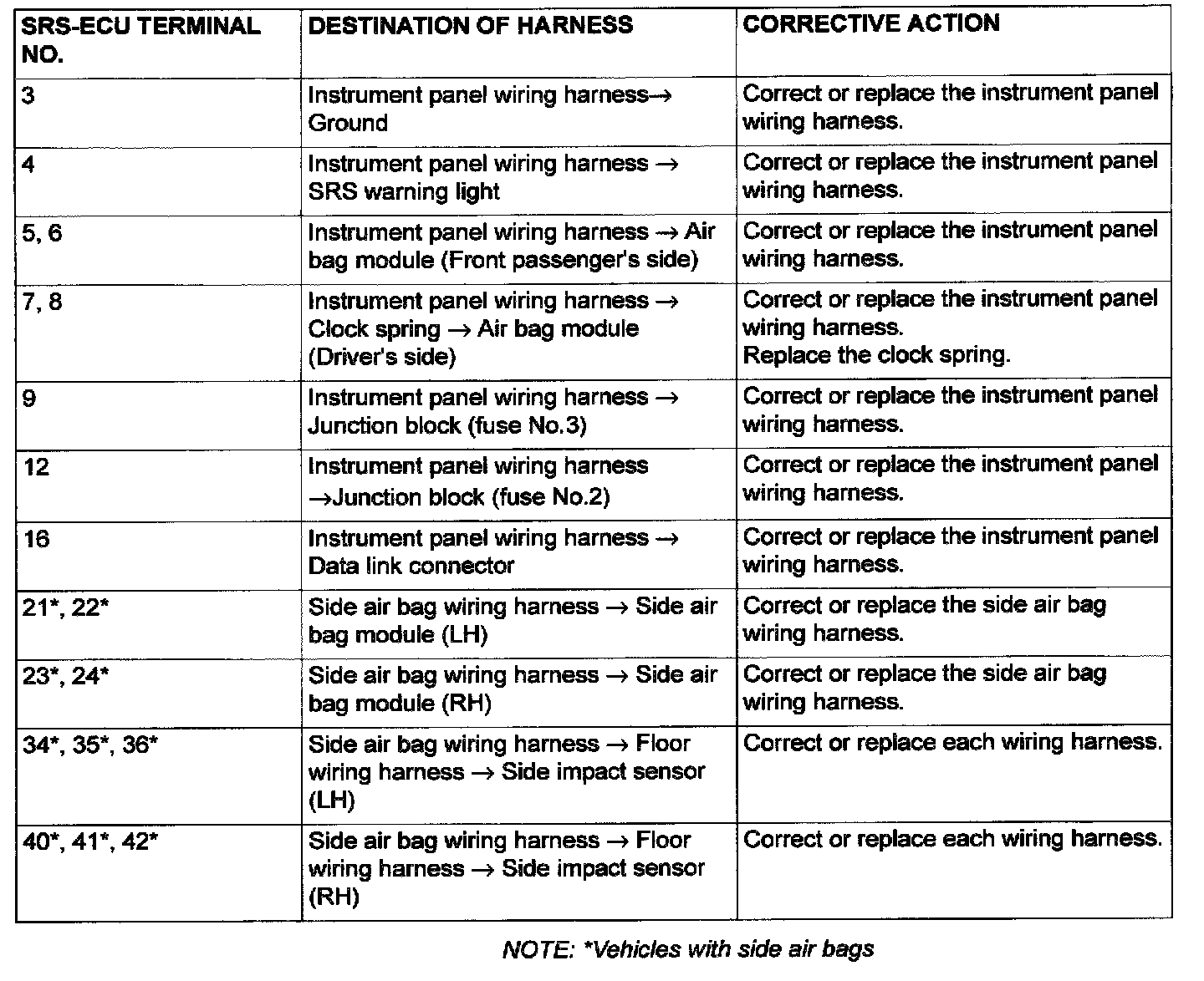- Do not attempt to repair the wiring harness connectors of the SRS. If any of the connectors are diagnosed as faulty, replace the wiring harness. If the wires are diagnosed as faulty, replace or repair the wiring harness according to the table.