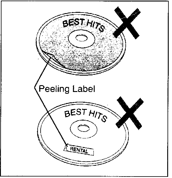 ^ Stick-on Labels - A poor quality disc with an improperly adhered label, or one with a poorly placed label can cause disc skip conditions. DO NOT use discs with labels that are poorly attached or not adhered properly.