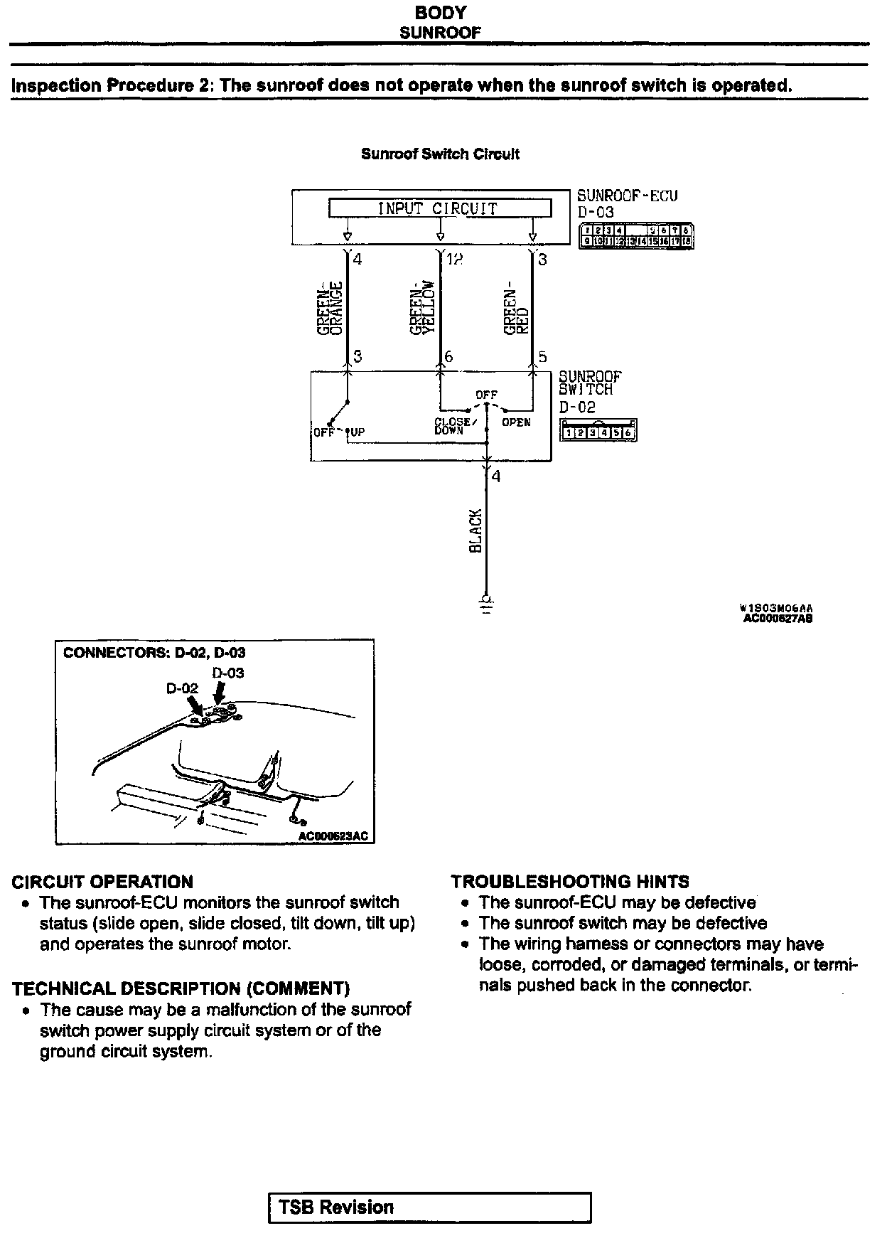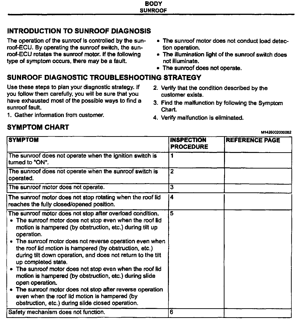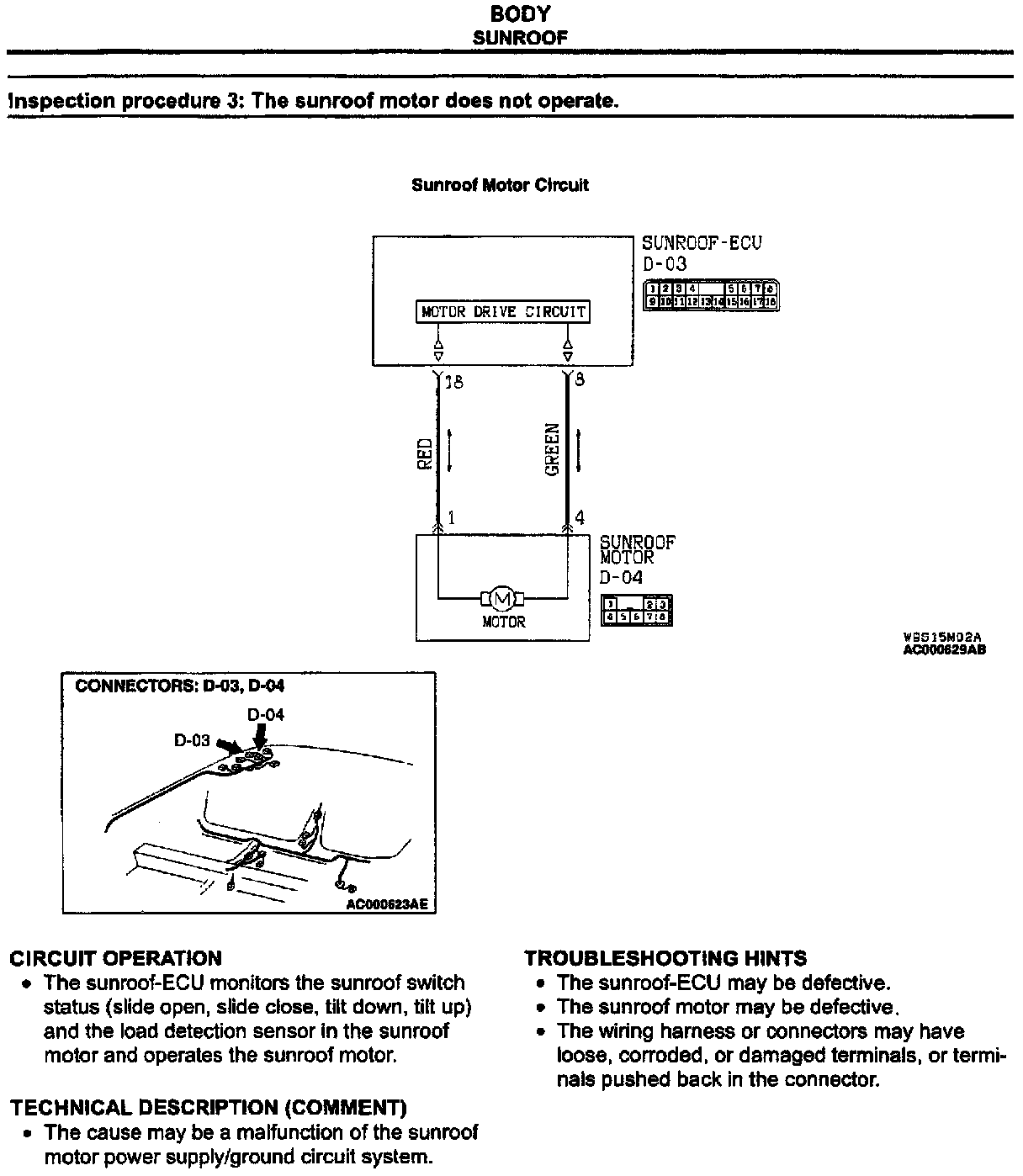Diagnosis procedures for sunroof operation are missing in the affected service manual. This bulletin contains sunroof assembly diagnosis procedures for 2002 Galant.