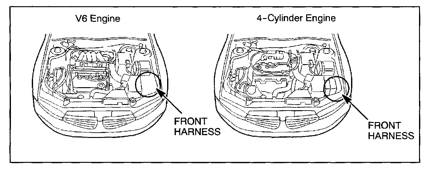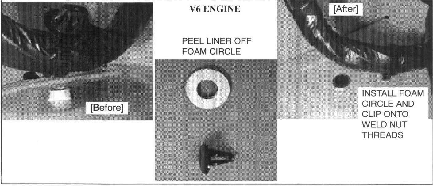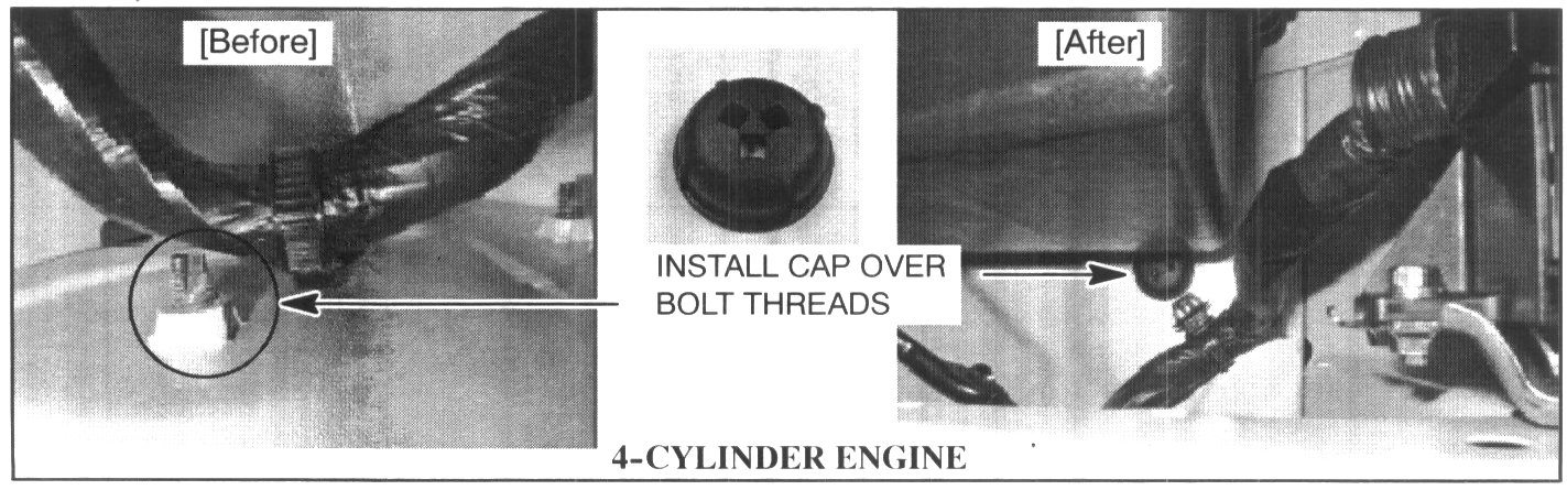 Inspect the front harness for damage and repair as necessary. Install a plastic protector over the weld nut (V6 engine) or over the bolt (4-cylinder engine) as described in this bulletin.