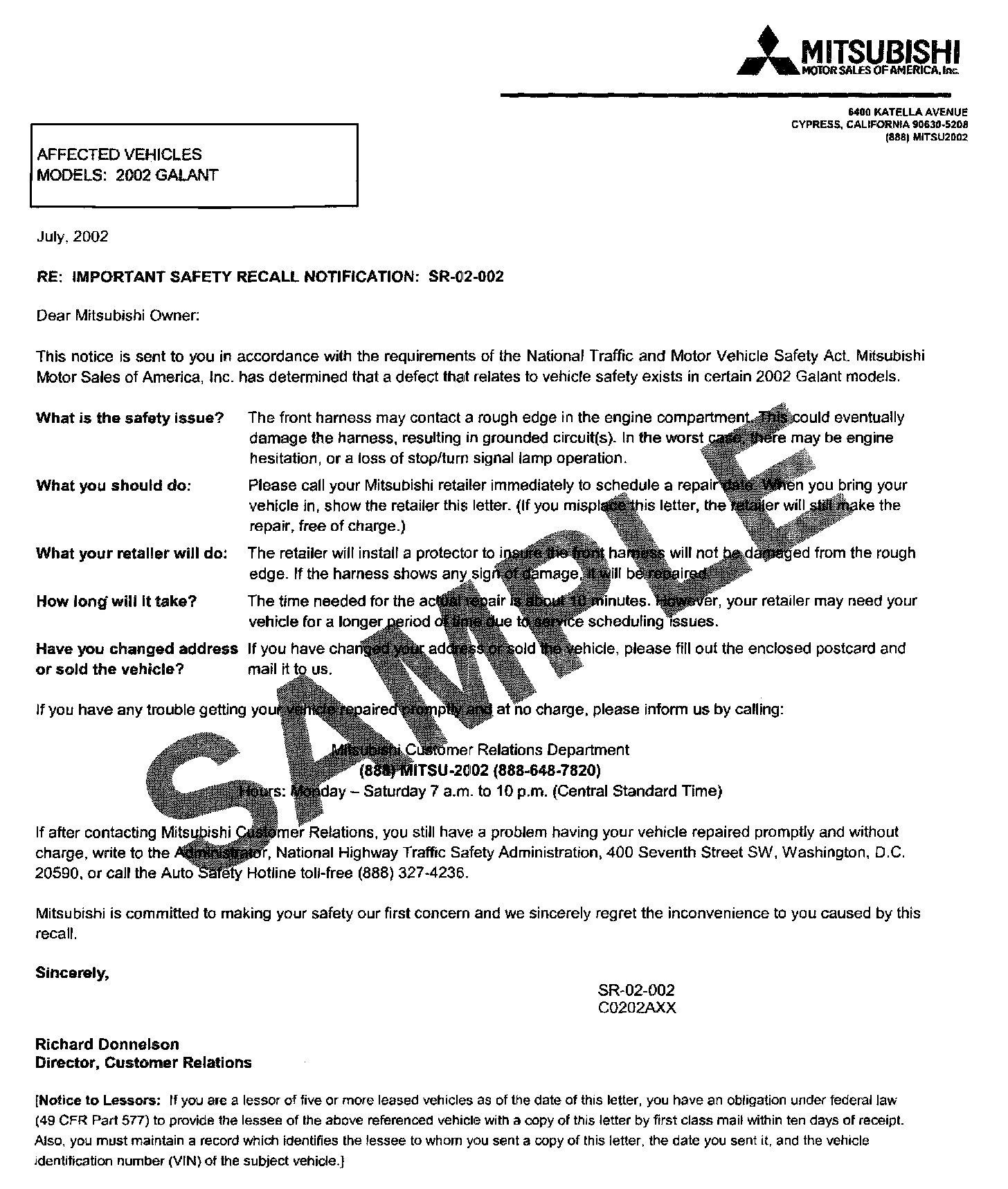 A letter will be sent to all owners of affected vehicles, telling them to bring their vehicle to their Mitsubishi Motors dealer to have the front harness inspected. A copy of the customer notification letter appears later in this bulletin.