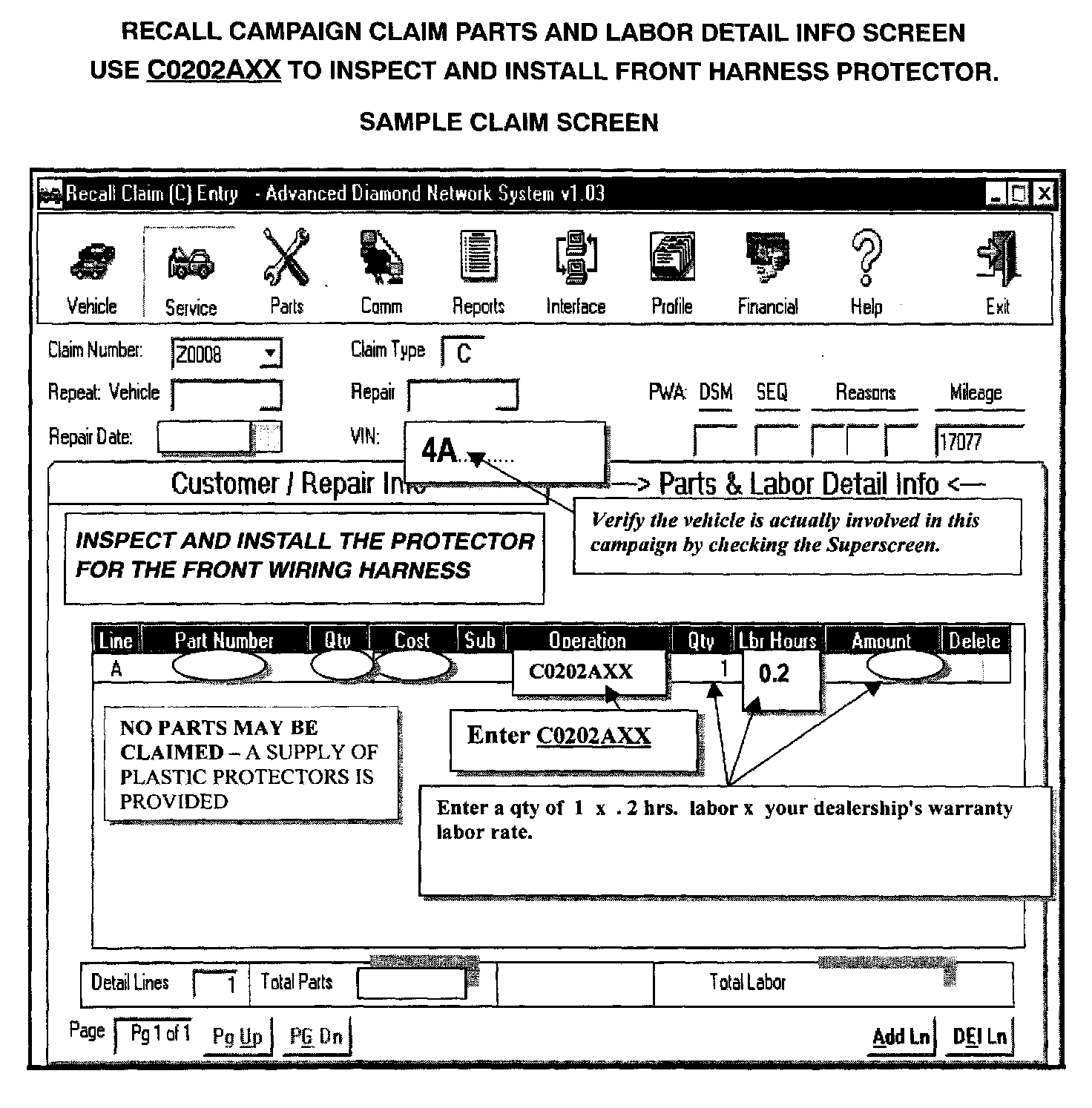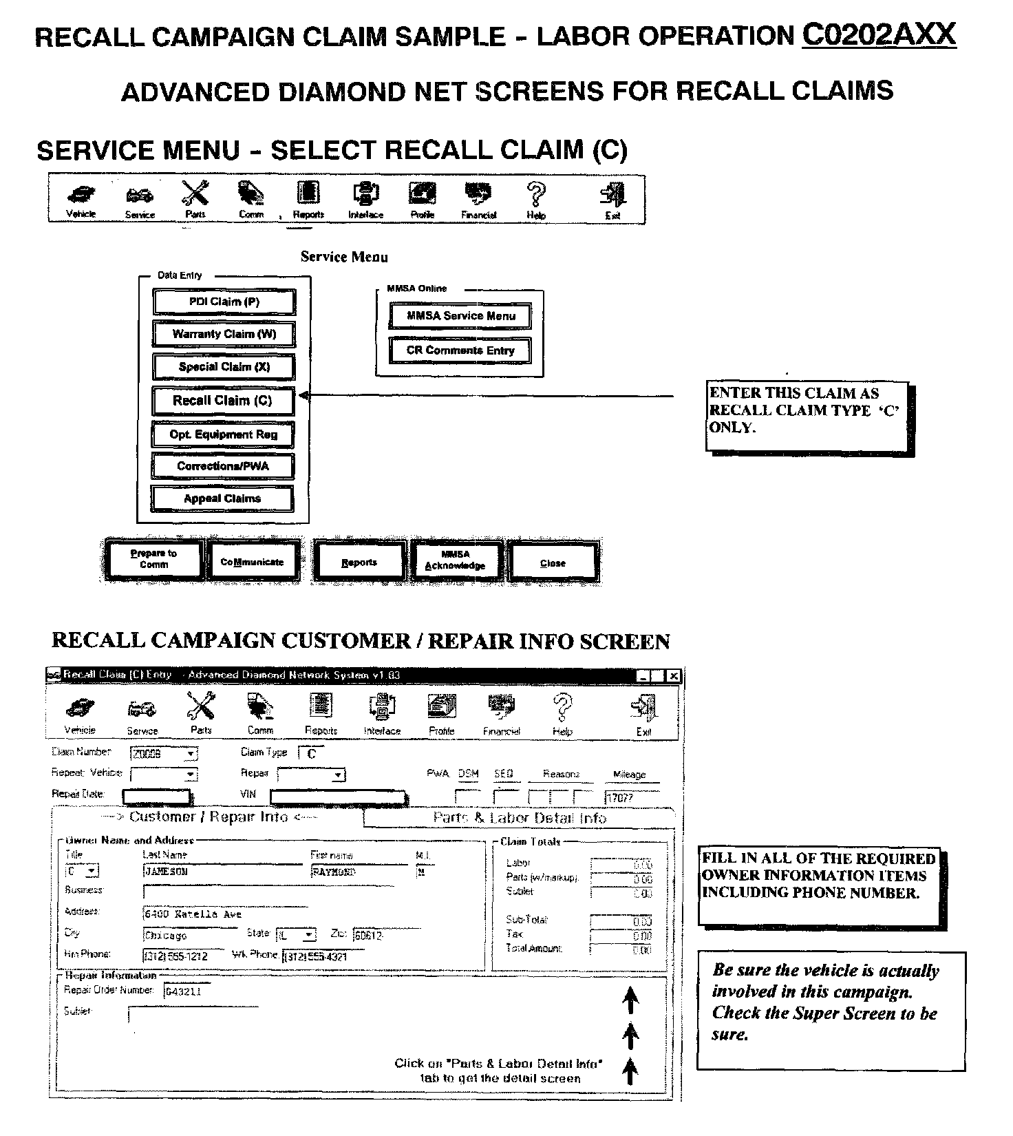 Claims for this campaign must be entered as Recall type "C" claims on your Diamond Network Service Menu. Sample claim screens are shown.