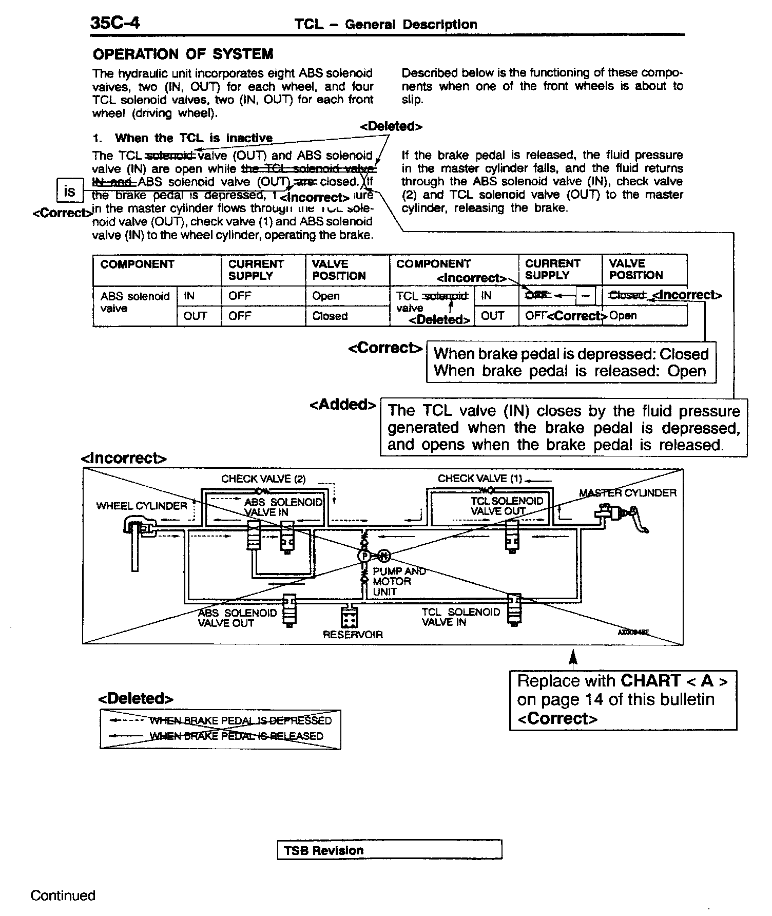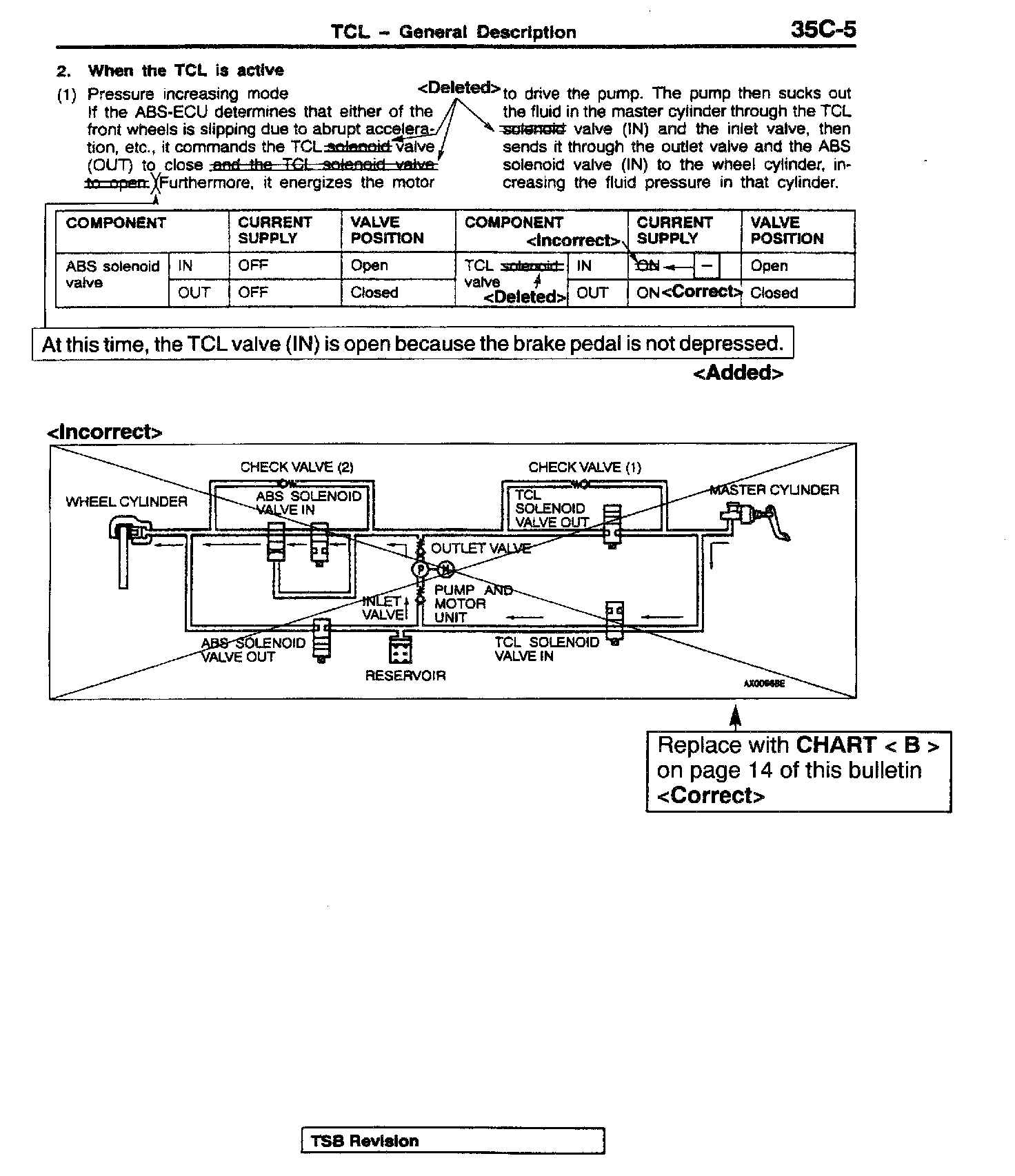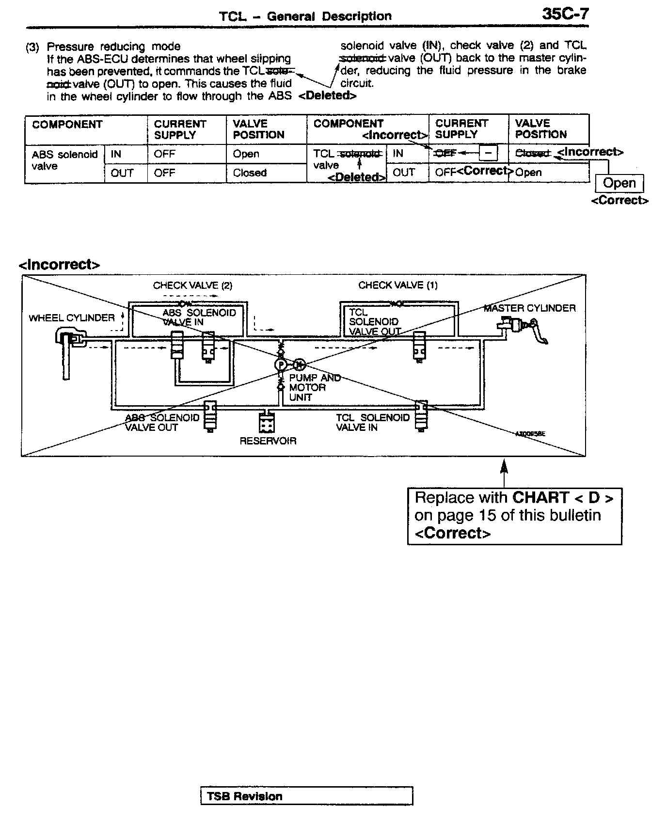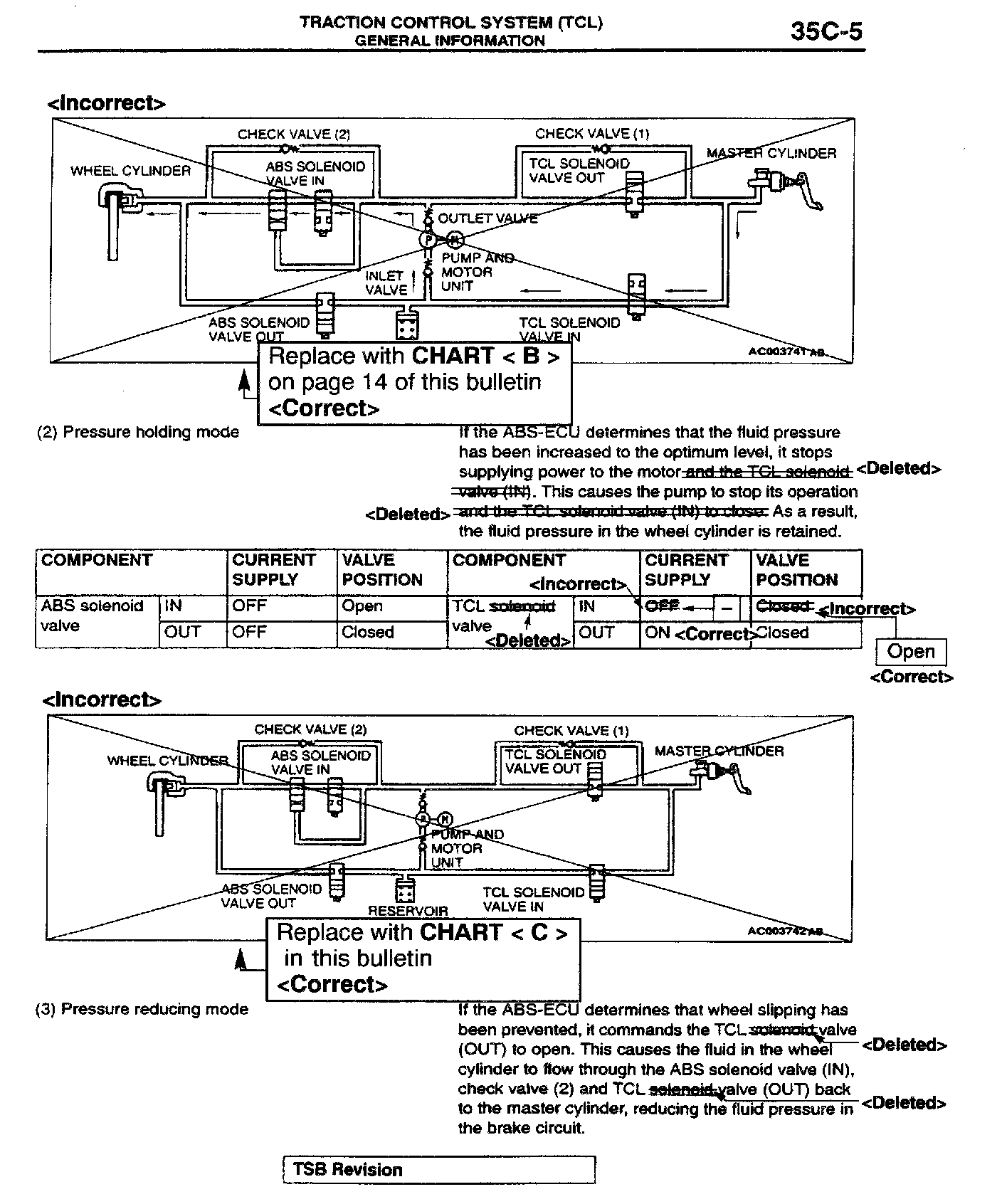 This bulletin corrects various descriptions, circuit diagrams, and fluid pressure diagrams related to the TCL solenoid valve.