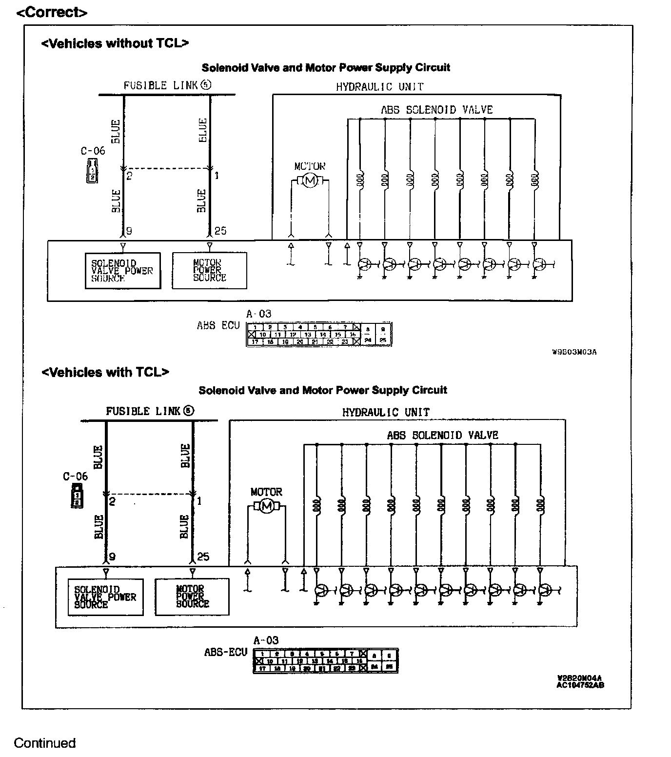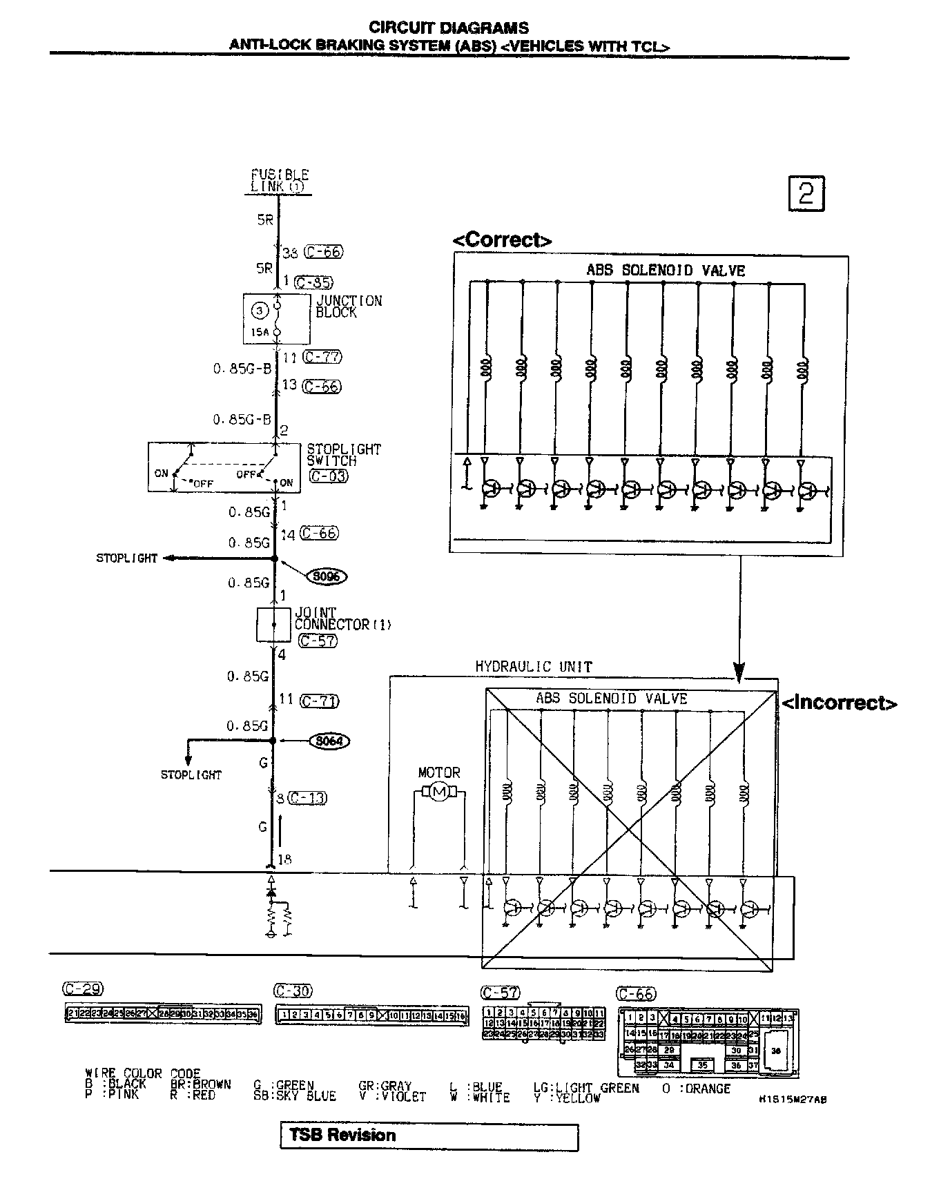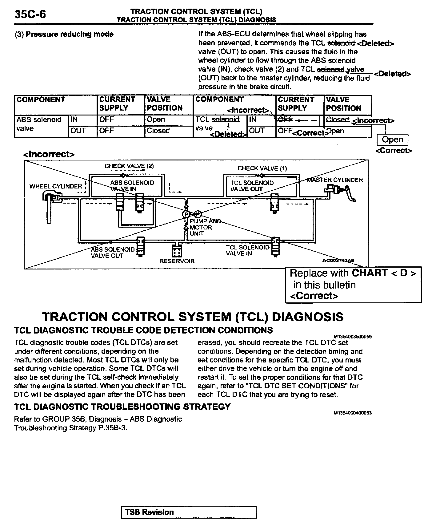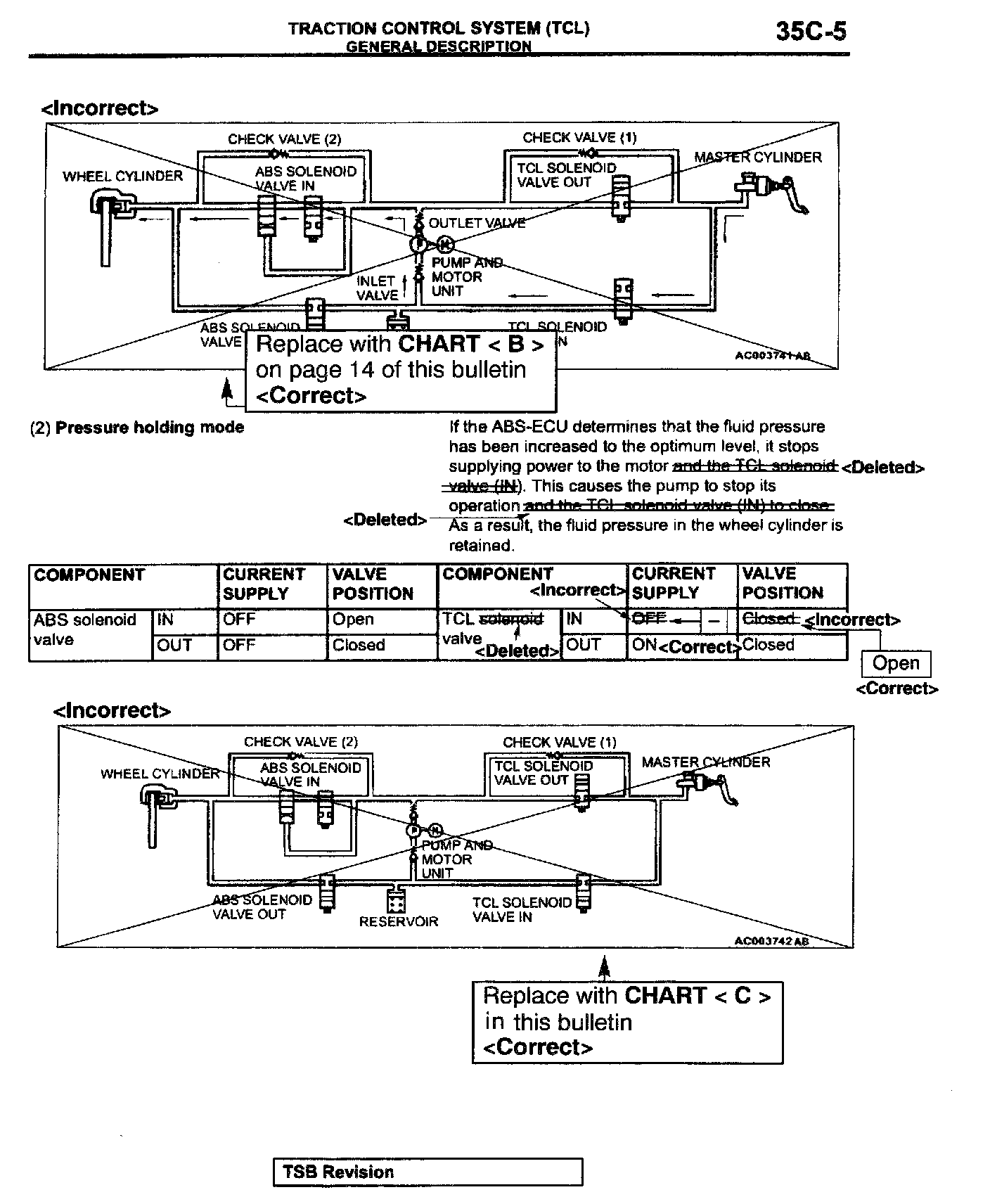 This bulletin corrects various descriptions, circuit diagrams, and fluid pressure diagrams related to the TCL solenoid valve.
