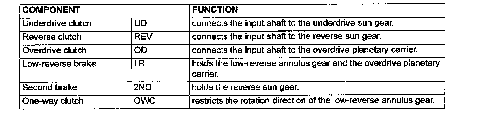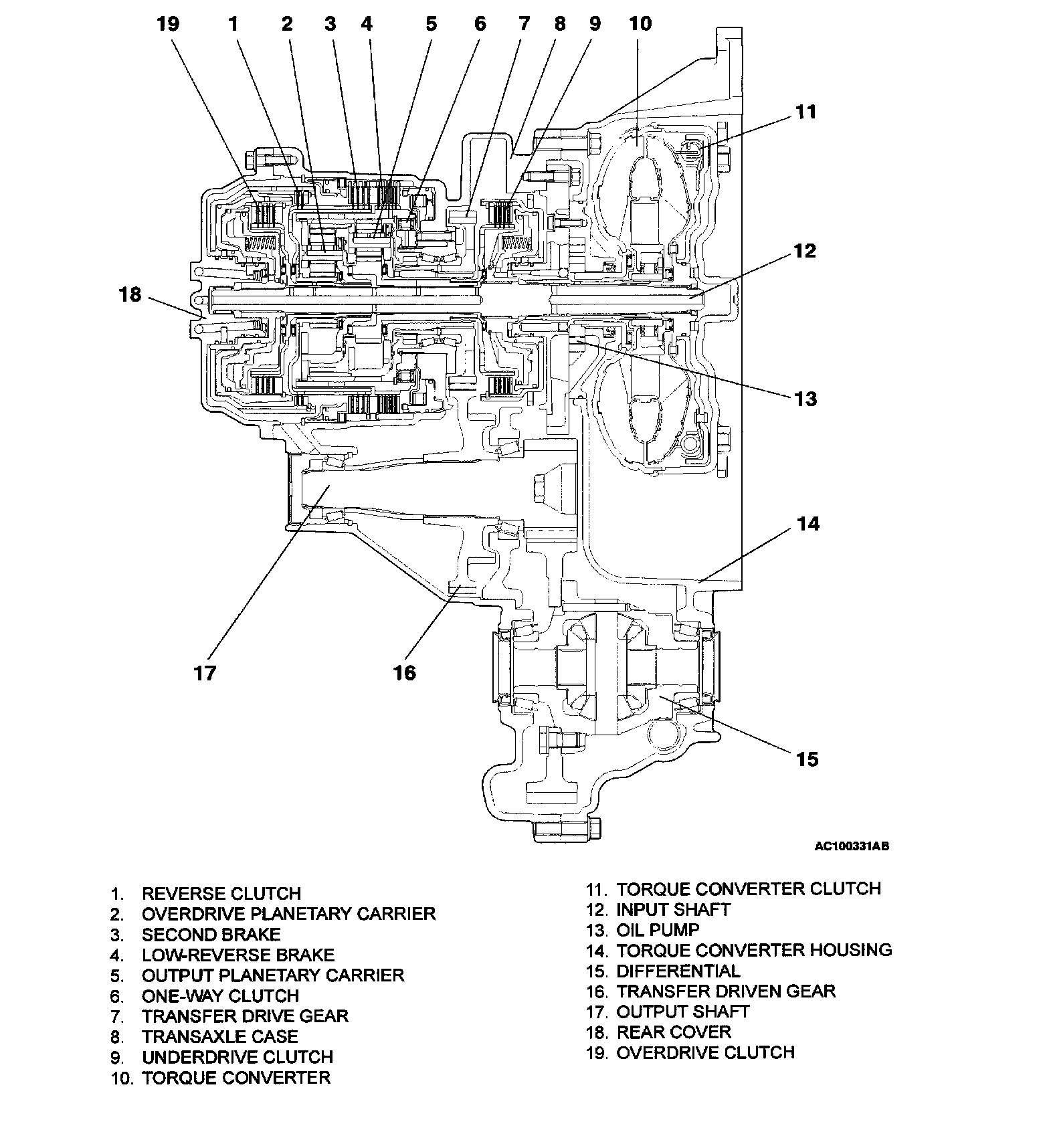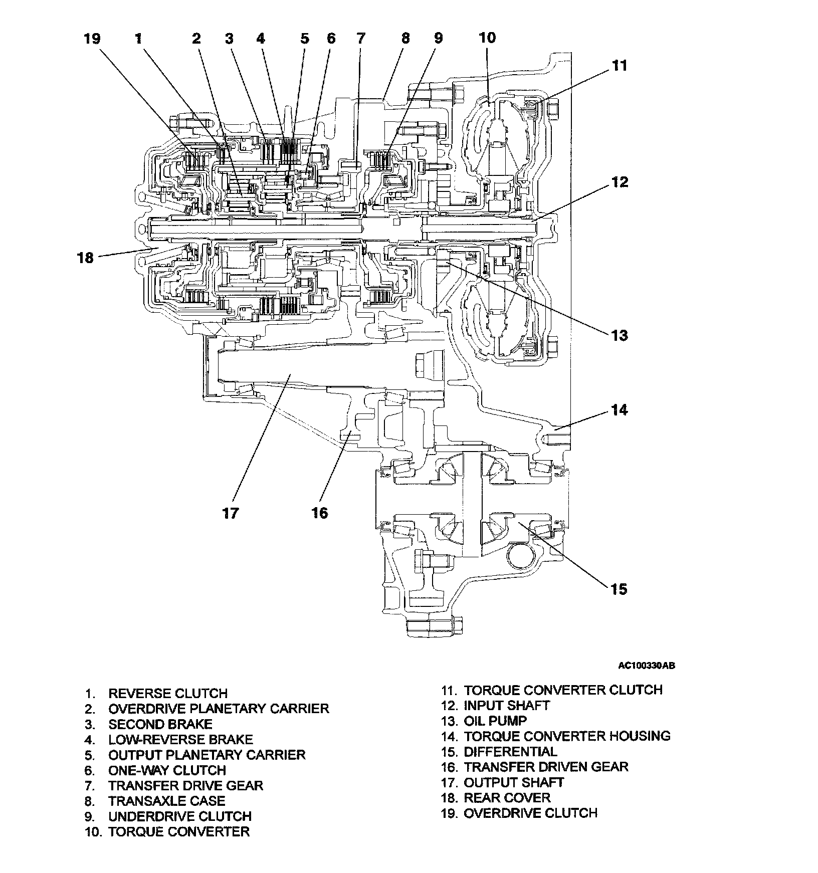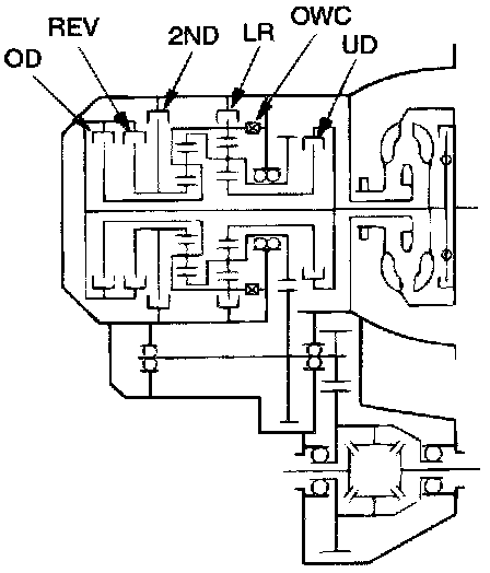 The transaxle is made up of the torque converter and gear train. A 3-element, 1-step, 2-phase torque converter with built-in torque converter clutch is used. The gear train is made up of three sets of multi-plate clutches, two sets of multi-plate brakes, one set of one-way clutches and two sets of planetary gears. The planetary gears are made up of sun gears, carriers, pinion gears and annulus gears.