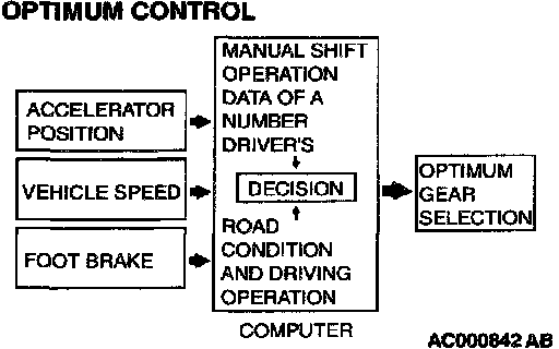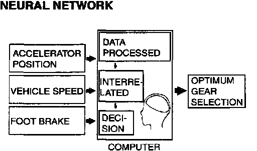 1. The shift patterns found satisfying by the typical driver for all ranges of driving are stored in the computer's memory. The computer uses this data to analyze road conditions and the driver's style of operation, and then outputs the optimal shift patterns stored in its memory to best match the conditions.