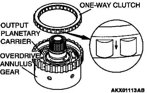 Insert the one-way clutch into the overdrive annulus gear so that the arrow points towards the output planetary carrier.