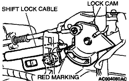 2. Fasten the shift lock cable at the position where the end of the shift lock cable is positioned above the red marking.
