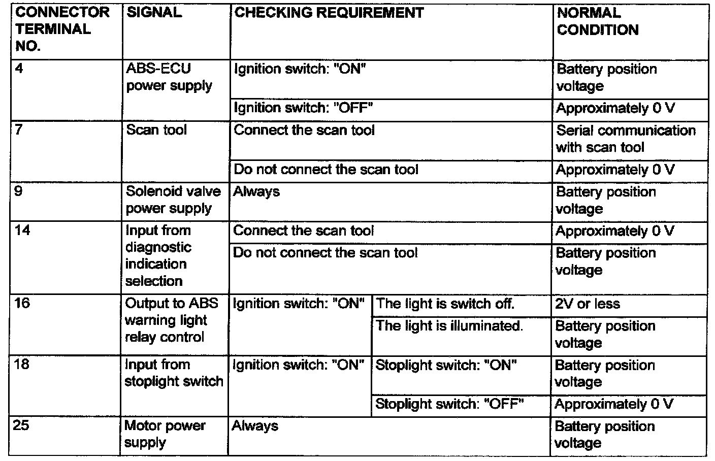 NOTE: Do not measure terminal voltage for approximately three seconds after the ignition switch is turned to "ON" The ABS-ECU performs the initial check during that period.