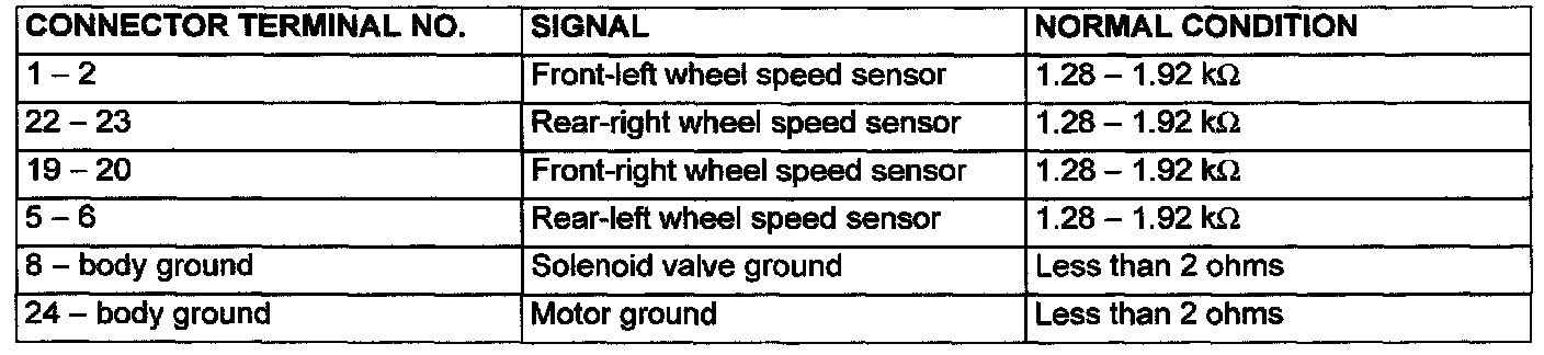 1. Turn the ignition switch to the "LOCK" (OFF) position and disconnect the ABS-ECU connector before checking resistance and continuity.