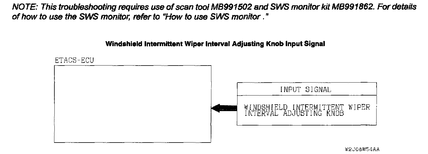 If the windshield intermittent wiper interval is not changed by operating the windshield intermittent wiper interval adjusting knob or according to the vehicle speed, the column switch, the ETACS-ECU or the front-ECU may be defective.