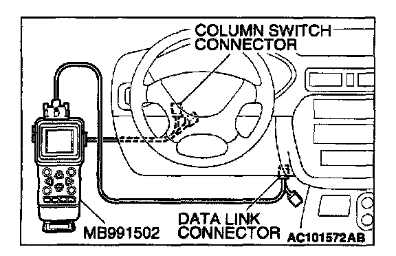 CAUTION: To prevent damage to scan tool MB991502, always turn the ignition switch to the "LOCK" (OFF) position before connecting or disconnecting scan tool MB991502. Also connect SWS monitor kit MB991862 after turning on scan tool MB991502.