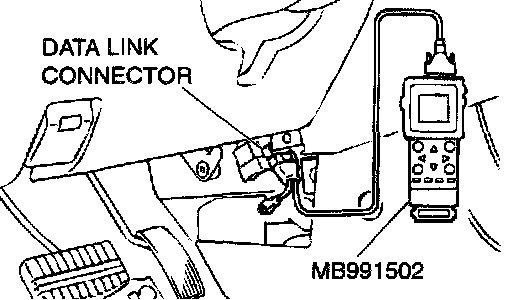CAUTION: To prevent damage to scan tool MB991502, always turn the ignition switch to the "LOCK" (OFF) position before connecting or disconnecting scan tool MB991502.