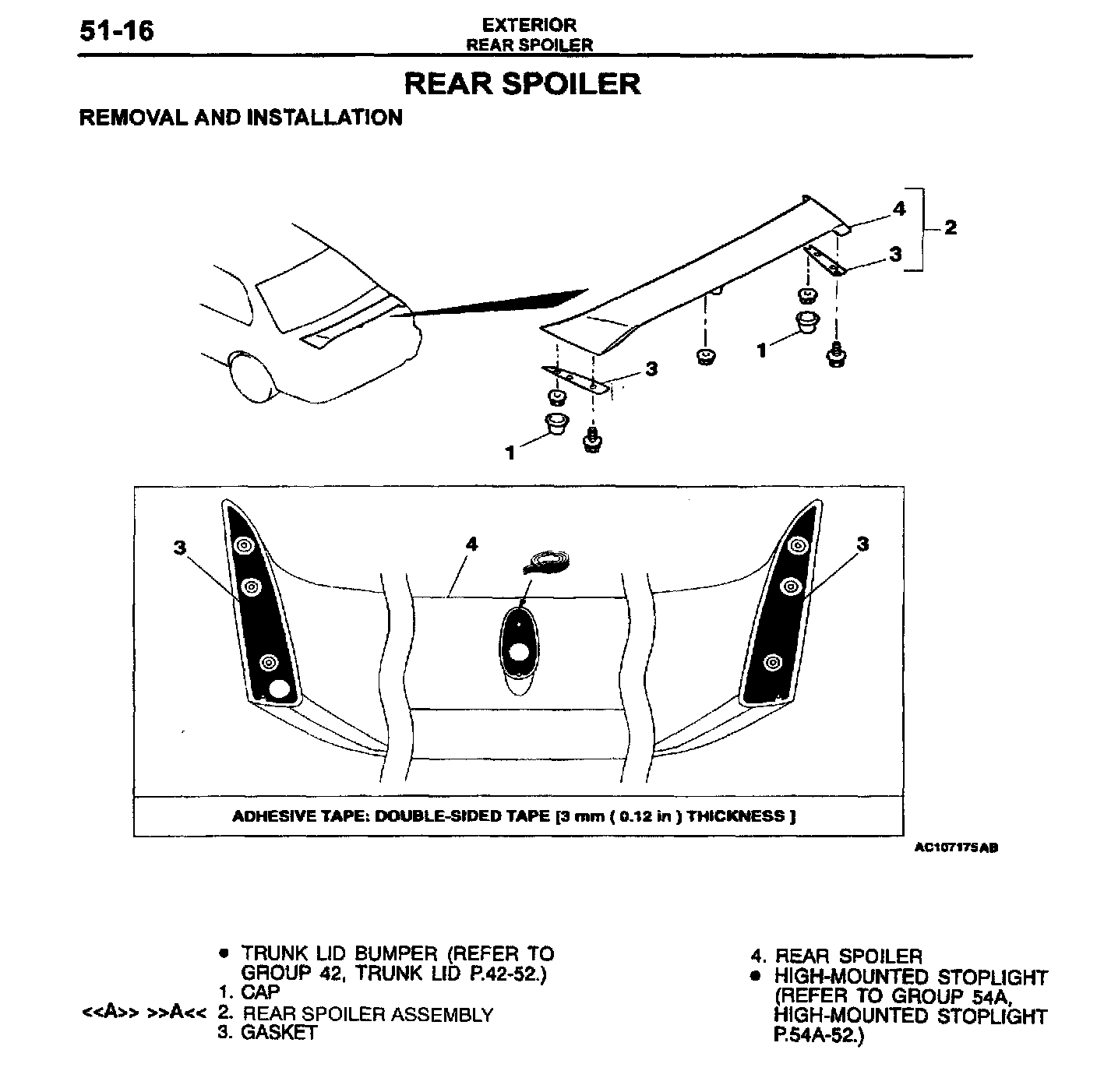 Illustrations and removal/installation instructions for the rear spoiler are incorrect in the affected manual pages. This bulletin contains the correct spoiler illustration and instructions.