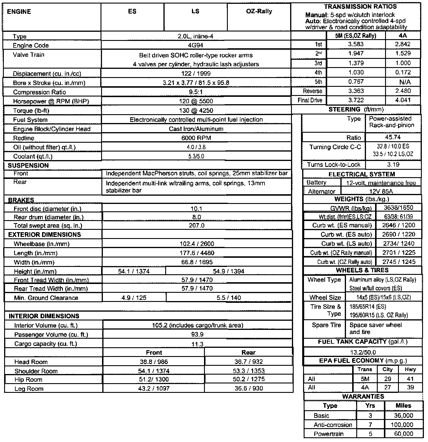 2002 LANCER TECHNICAL SPECIFICATIONS