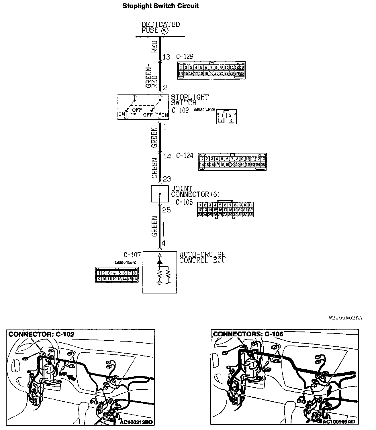 1. Disconnect harness connector C-102 at the stoplight switch.