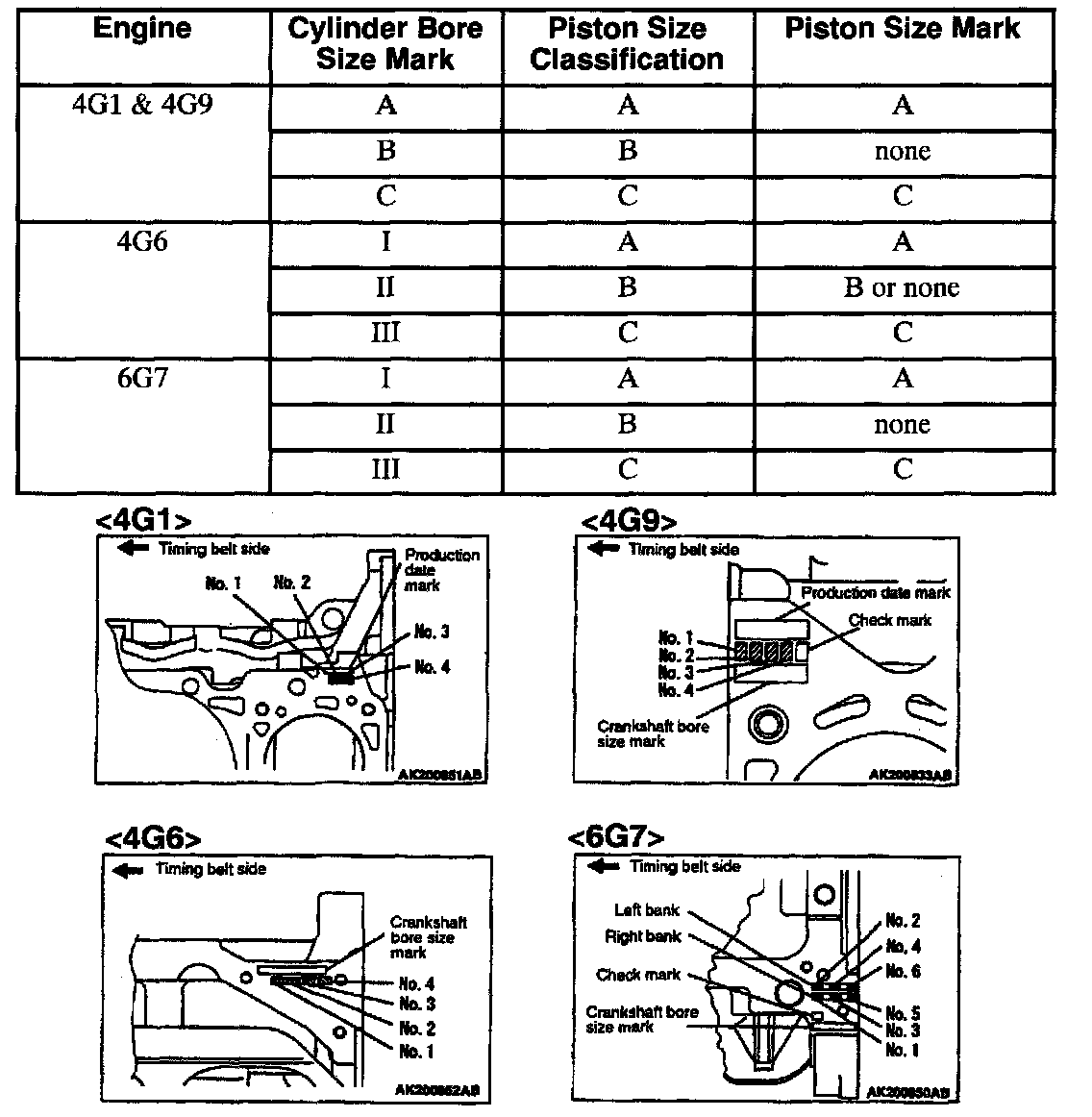 When replacing a piston, be sure to use a piston of the appropriate size. Based on the Cylinder bore size mark stamped on the cylinder block, select an appropriate size replacement piston from the table provided in this bulletin.