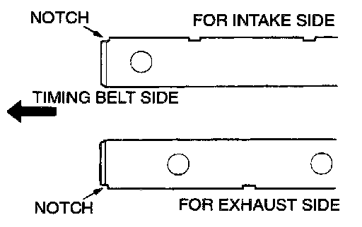Install the rocker arm shafts, place the end with notched side toward the timing belt side as shown.