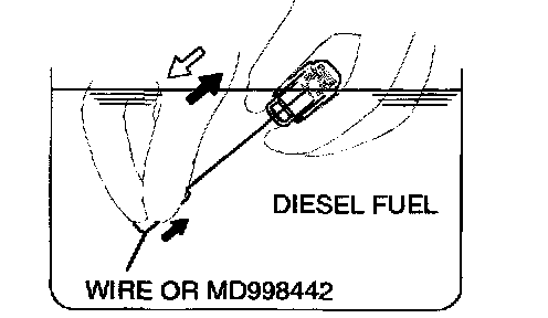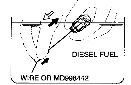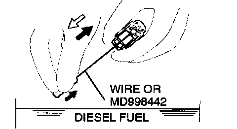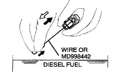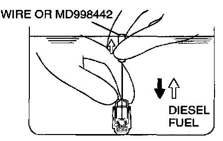 3. While gently pushing down the internal steel ball using wire [0.5 mm (0.020 inch) in diameter] or special tool MD998442, move the plunger through 5 to 10 strokes until it slides smoothly. In addition to eliminating stiffness in the plunger, this operation will removed dirty oil.