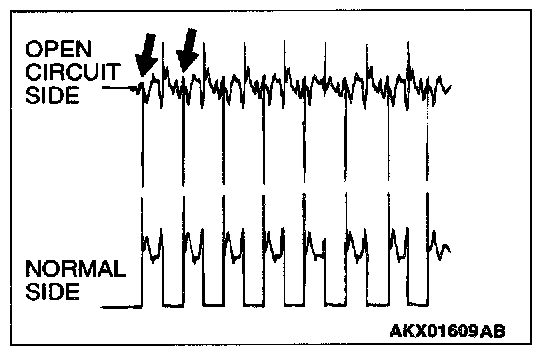 - Current is not supplied to the motor coil on the open circuit side. (Voltage does not drop to 0 volt.) Furthermore, the induced electromotive force wave pattern at the normal side is slightly different from the normal wave pattern.
