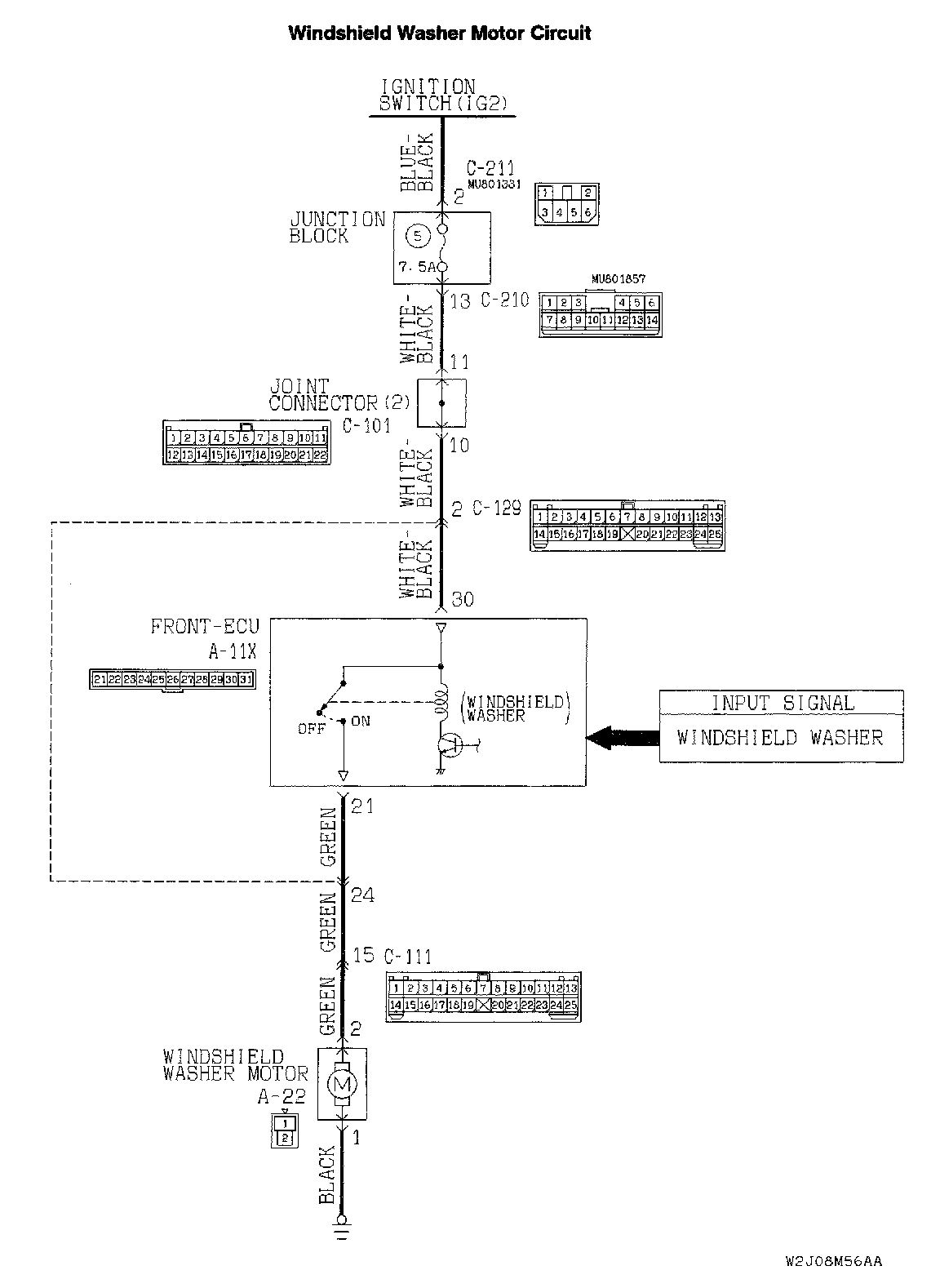 Q: Are windshield washer motor connector A-22 and front-ECU connector A-11X in good condition?