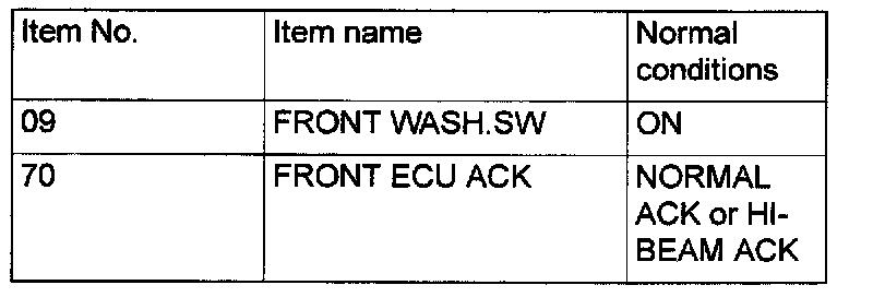 Select "WIPER WASH" (FUNCTION DIAG.), and check that normal conditions are displayed on the items described in the table.