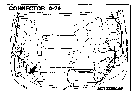 1. Disconnect front turn-signal light (RH) connector A-20, and measure at the wiring harness side.