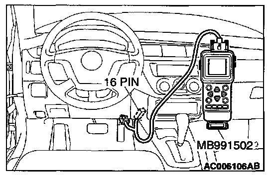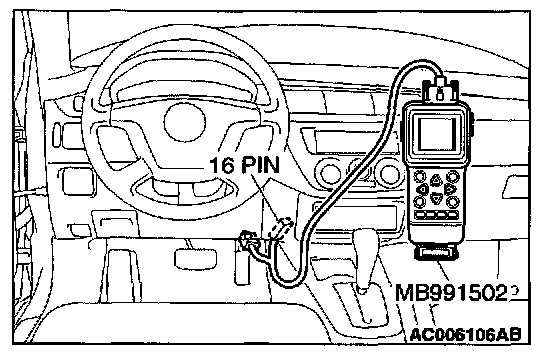 CAUTION: To prevent damage to scan tool MB991502, always turn the ignition switch to the "LOCK" (OFF) position before connecting or disconnecting scan tool MB991502.