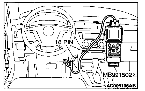 CAUTION: To prevent damage to scan tool MB991502, always turn the ignition switch to the "LOCK" (OFF) position before connecting or disconnecting scan tool MB991502.