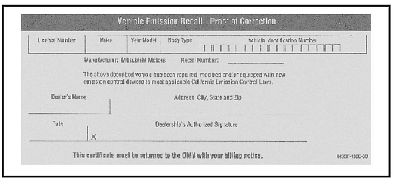 12. FOR VEHICLES REGISTERED IN CALIFORNIA ONLY: Complete a "VEHICLE EMISSION RECALL - PROOF OF CORRECTION" form (p/n MSSF-106D-00). Give the completed form to the vehicle owner.