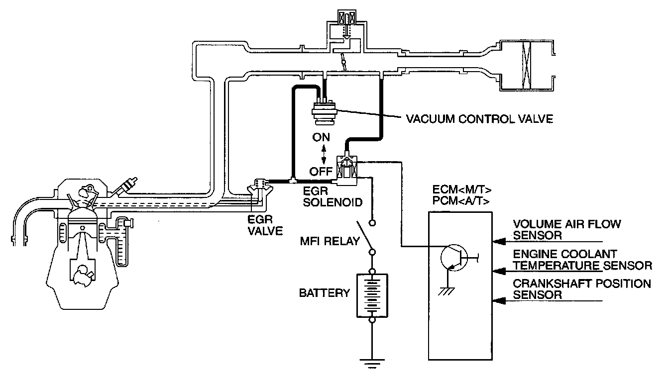 GENERAL DESCRIPTIONThe exhaust gas recirculation (EGR) system lowers the oxides of nitrogen (NOx) emission level. When the air/fuel mixture combustion temperature is high, a large quantity of NOx is generated in the combustion chamber. Therefore, this system recirculates part of exhaust gas from the exhaust port of the cylinder head to the combustion chamber through the intake manifold to decrease the air/fuel mixture combustion temperature, resulting in reduction of NOx.