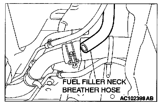 1. Place a drain pan, and disconnect the fuel filler neck breather hose at pipe side.
